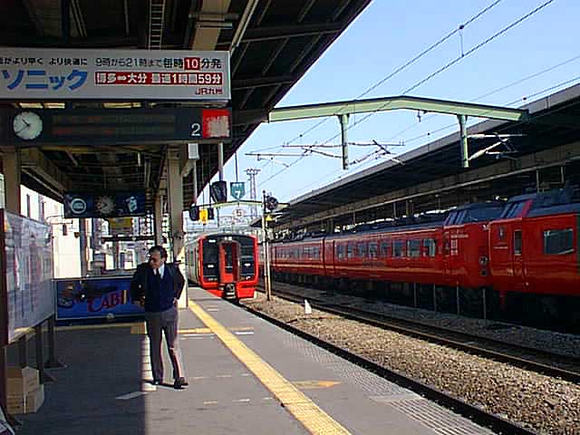 3分前に、博多行特急有明号が出ていった。サラリーマンで中間管理職をやってそうな人たちが乗った。でも、今目の前にも同じような人がいる。方や特急のグリーン車、方や各駅停車の列車。少々目の前の人が可哀想になってくる。