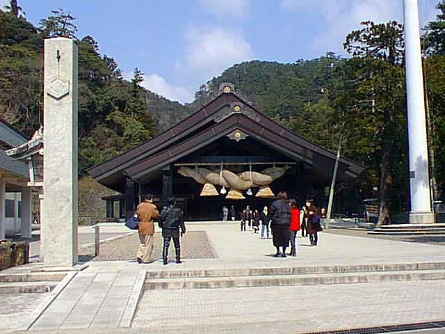 出雲大社。思ったほど人は多くない。神楽殿の大注連縄の大きさに驚く。5円玉を放ってお参りをする。隣では、手を何回もたたいたりお辞儀を何回もしたりといかにも本式らしくやっているが、わたしはそんなやり方を知らない。無難に、パンパンと手をたたきお辞儀を1回する。その後、大注連縄に10円玉を放る。5円玉でやりたかったのだが、残念ながらもう10円玉しかない。下から投げて、縄にうまく刺されば成功。20人ぐらいが、次々と硬貨を投げる。案外難しいらしい。そう思ってやってみると、2回目に成功した。それほど難しくない。